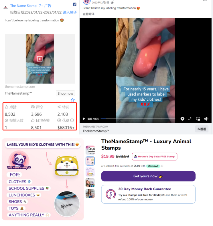 和之前分享的热门广告相比,除了点赞量高,这个广告的评论、转发量也特别高,侧面透露出它确实引发了消费者的兴趣。定制化姓名印章这个产品比较新奇特别,市场需求量很大。可能的需求场景:1.国外很多家庭有不止一个孩子,可能有3-4个小孩,小孩的衣服一起洗的时候很容易分不清楚谁是谁的。2.孩子去上学的时候东西很容易混在一起不知道是谁的。这个姓名印章既美观,用途也很广泛,适用于衣物、背包、玩具、笔袋、雨伞等东西。原产品打折后都要19.99美元,价格昂贵,在国内能以远低于这个价格的成本价拿下,利润率高。且小印章体积小,重量轻不易碎,非常方便运输~