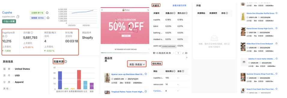 本周分享的店铺是Cupshe, 一家在线泳装和海滩服饰零售商,是中国时尚品牌出海的巨头之一。Cupshe抓住欧美市场对泳装的巨大需求,瞄准泳装市场,产品线多样,包括:各种颜色和款式的一体式泳装、分体式泳装(比基尼)、沙滩服饰、墨镜、帽子、游泳圈等各类沙滩游泳用品。Cupshe品牌主打“品质、时尚、实惠”的高性价比泳装,区别于Shein泳装低至个位数的价格,Cupshe泳装均价在20-30美元。
