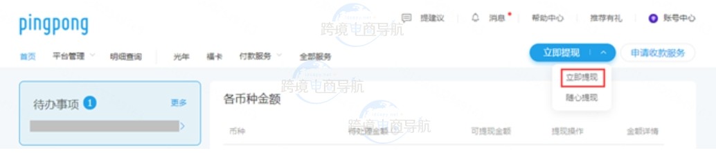 ① 点击PingPong账户右上角点击立即提现—再选择立即提现;
