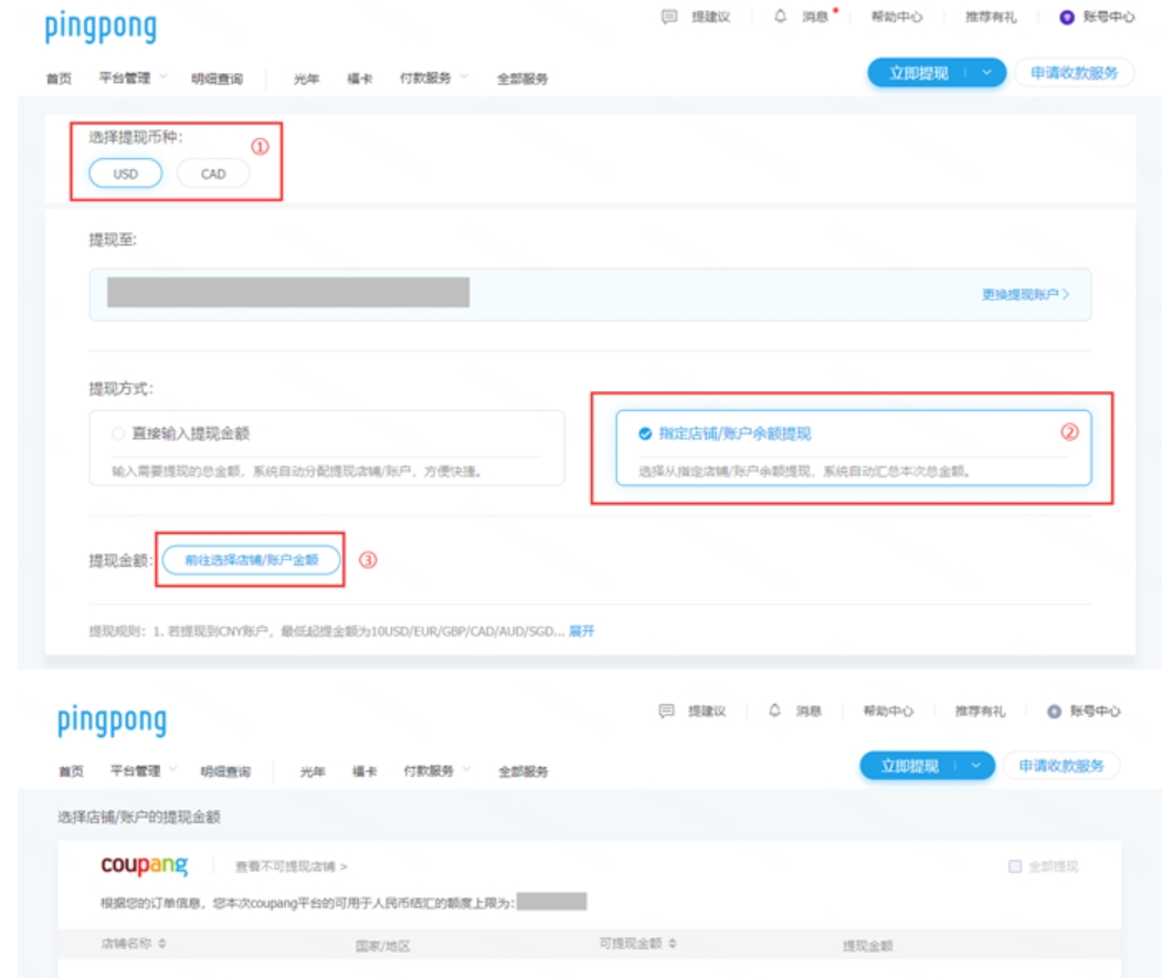 ② 选择对应的币种—选择指定店铺/账户余额提现—点击前往选择店铺/账户金额,查看对应平台可结汇额度。