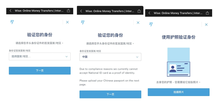 2.选择身份证签发的国家/地区,中国用户身份证件需提供护照,按要求拍摄护照照片+一张自拍照;