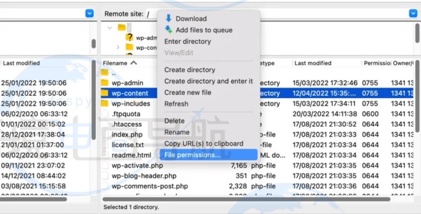 就这样刷新并访问WordPress管理后台,尝试上传图像看看。如果还看到“缺少临时文件夹”错误消息,则检查wp-content文件夹的文件夹权限。使用FTP客户端,转到WordPress网站的根文件夹。之后右键单击 wp-content 文件夹并选择“文件权限…