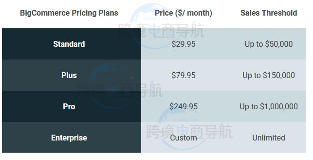 Bigcommerce的价格从29.95美金起,没有交易手续费,这仅限于每个月5万美金以下销售额的店铺,如果你销售金额大于5万美金就要升级到79美金的套餐,当然这对于很多卖家来说一个月要做到5万美金也不是一开始就能做到,如果做到了也不差那点钱,这相对于shopify来说还是非常划算的。