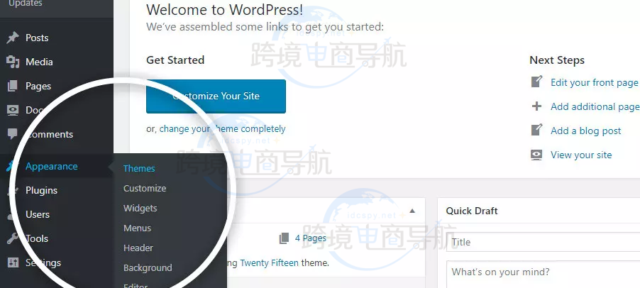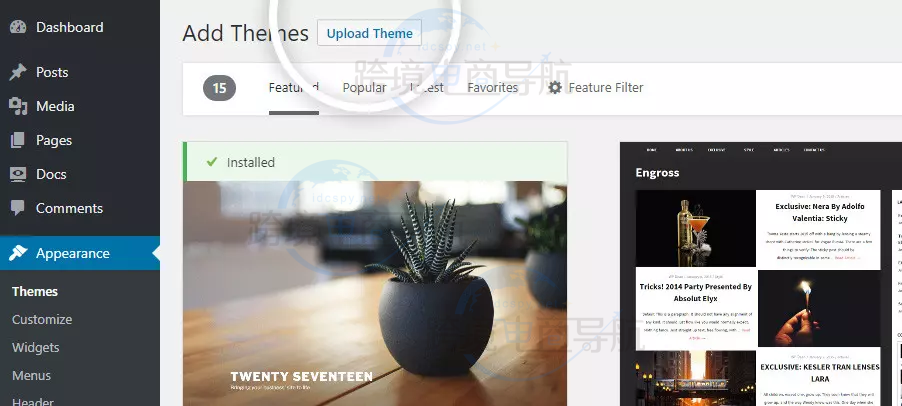 1.登录WordPress管理面板,从WordPress管理面板菜单找到外观(Setting)中的主题(Theme);
