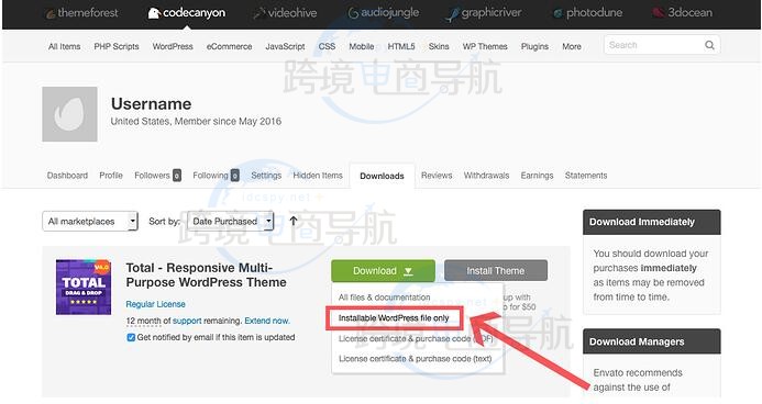 登录ThemeForest帐户首先找到下载位置,然后找到购买主题单击下载按钮,然后选择“仅可安装的WordPress文件”就可以下载主题的zip文件。