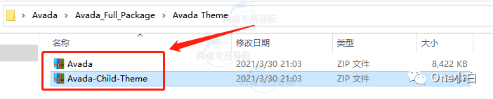 在下载的Avada完整主题文件包的第一个文件夹Avada Theme里面,就包含了两个可安装的主题程序压缩包,父主题Avada和子主题Avada-Child-Theme。