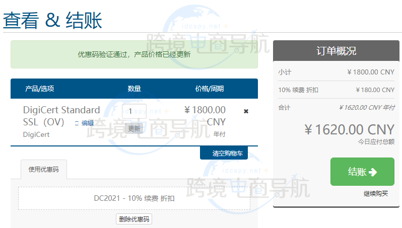 活动期间(2021年9月10日-2021年10月20日),凡在安信SSL证书购买DigiCert系列(包括DigiCert、Symantec、GeoTrust、Thawte、RapidSSL )的SSL证书均可以享受9折的优惠,购买时直接输入优惠码【DC2021】,点击提交优惠码,然后点击结账,如下图所示:
