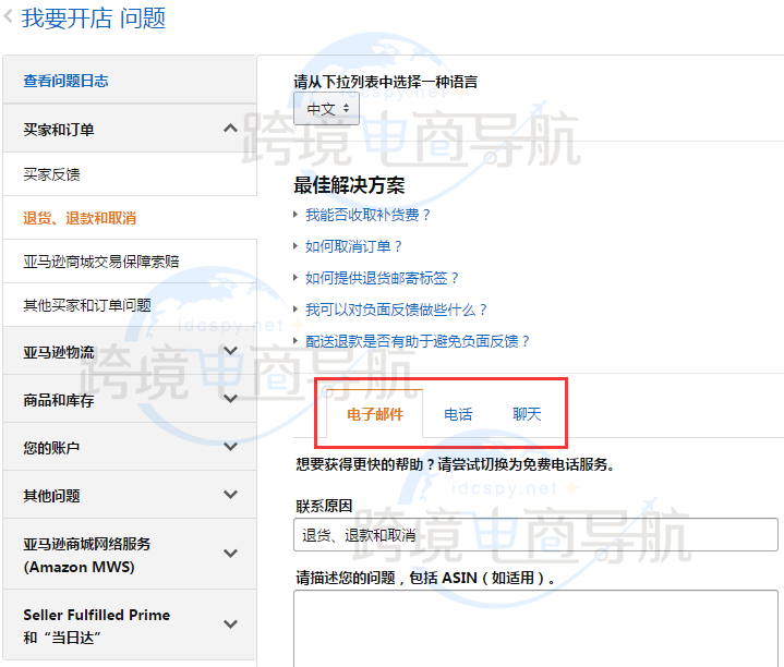 下面以退货,退款和取消 的问题为例,有三种联系卖家支持的方式:邮件,电话,即时聊天,选择任意一种进行咨询。