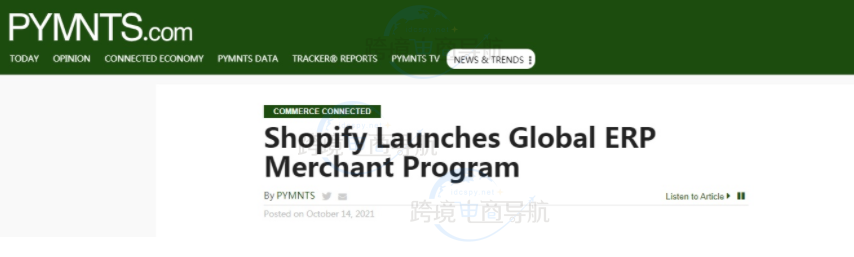 2021年10月15日,根据PYMNTS报道称:Shopify正在与一系列企业资源规划(ERP)供应商合作,以提供直接集成到Shopify应用商店,从而实现工作流和更多数据驱动决策之间的无缝连接。