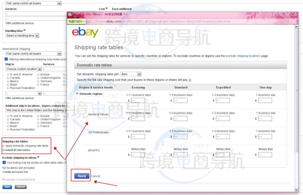 11、可在【Shipping rate tables】区域编辑航运费率表,点选【Apply domestic shipping rate table】来应用美国航运费率表,亦可点击【Create/Edit rate tables】来创建或编辑具体的航运费率表;