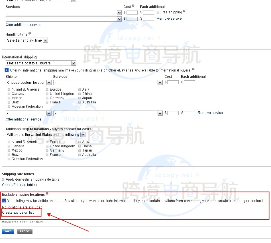 12、可在【Exclude shipping locations】中设置不能运达的国家/地区,可点击【Create exclusion list】来创建不能运达的国家/地区列表;