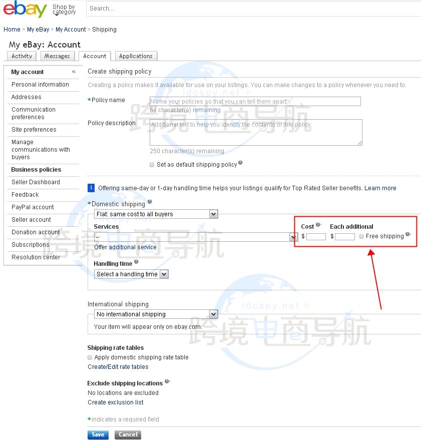 6、在【Cost】下面的文本框中可填写物品运费,在【Each additional】下面的文本框中填写每增加一件物品所要多付的运费。同时,可勾选【Free shipping】将物品设置为包邮以增加物品曝光率;