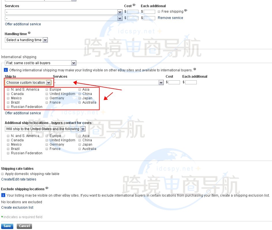 可在【Additional ship to locations – buyers contact for costs】下的复选框中设置其他运送目的地买家咨询的费用;