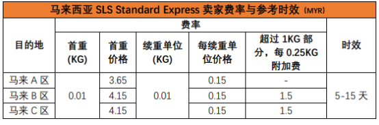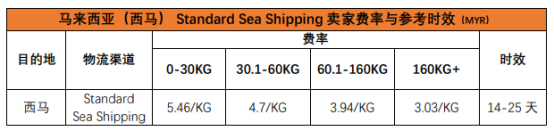 马来西亚跨境物流时效与卖家参考运费详见下表: