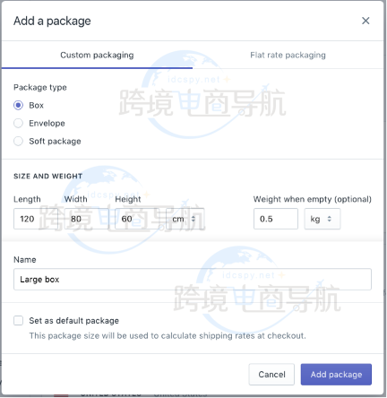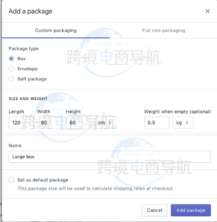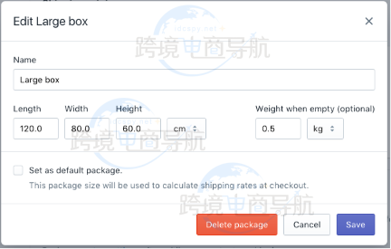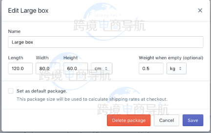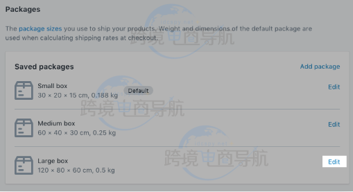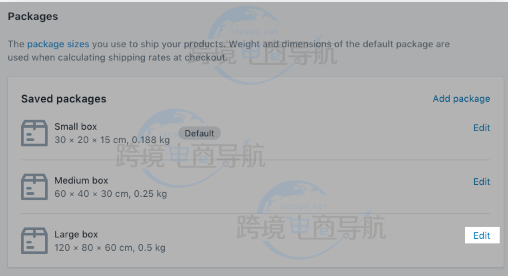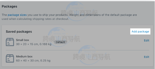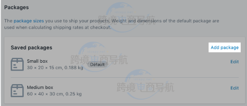 注:如果您的商店位于美国和加拿大境外,那么您只能添加一种首选的包裹类型。如果您的商店位于美国或加拿大,则可在Shopify后台的发货设置页面上保存首选包裹类型的尺寸和重量。