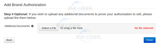 10、上传任何其他文件,以证明您的授权出售。此步骤是可选的,如果您已经按照上述步骤上传了这些文档,则不必上传任何其他文档。点击“finish”即可完成Wish品牌授权创建!