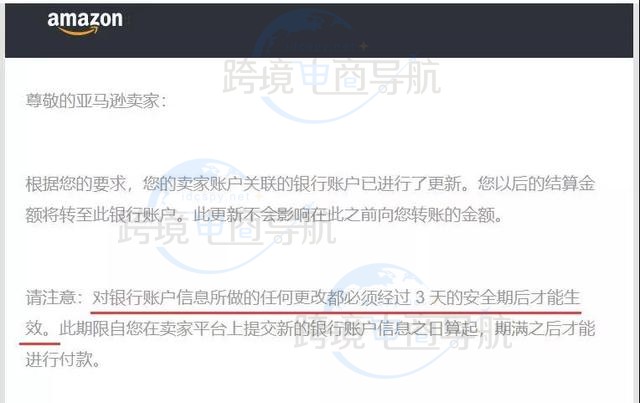 同时,亚马逊也会发邮件给到卖家。需要注意的是“卖家对银行账户信息所做的任何更改都必须经过3天的安全期后才能生效”,所以卖家尽量不要选在亚马逊将要打款到你银行账户的那几天修改存款方法。否则亚马逊打不进卖家账户的时候会延到下一个账期,如果你着急使用现金流,那就不要在这个时间内去修改。