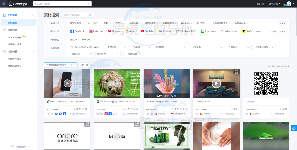 建议你使用广告素材工具帮助你获得视频创意的灵感。在此推荐一个广告素材工具GoodSpy。GoodSpy汇集了海外14个媒体平台投放的广告创意素材,包括Facebook、Instagram等。可以根据400多个品类进行分类筛选广告素材,直达你最需要的广告创意。