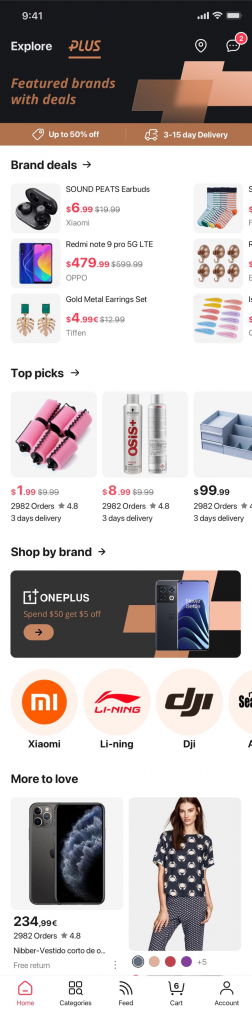 在点击首页“PLUS”进入频道后,可以看到,AE Mall频道页里包含了Brand deals、Top picks、Shop by brand等栏目。除了在速卖通APP首页有专区入口外,在搜索推荐方面AE Mall也有自己的入口:用户在搜索商品时,AE Mall商家的商品也会拥有自己的特别标识。