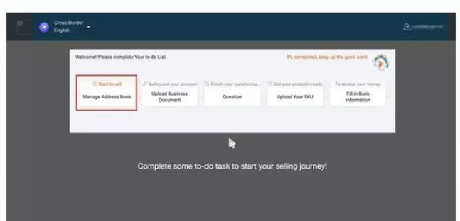 (2)填写地址信息:①点击“Start to sell”②选择中文:CrossBorder-> select Language ->Chinese③填写所有的地址信息:公司/仓库/退货地址;
