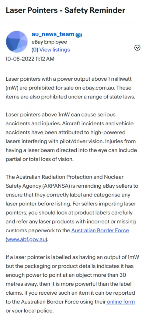 近日,eBay澳大利亚站发布公告称,禁止跨境电商卖家在eBay上销售输出功率超过1毫瓦(mW)的激光笔。原因是高功率的激光笔可能会导致严重的事故和伤害。