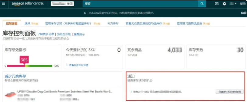 ① 在卖家平台顶部的下拉菜单中选择【库存】-【库存规划】进入库存控制面板,在通知栏中查看是否有受邀加入奥特莱斯限时促销的商品: