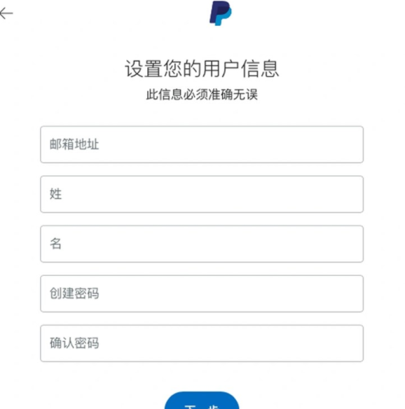 4)填写邮箱(就是PayPal账号)、姓名(必须和身份证一样,中文),设置账号密码;