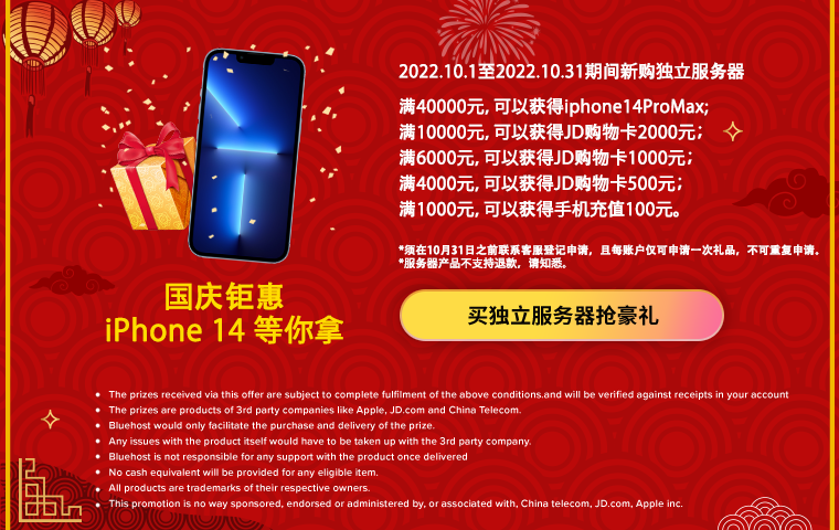 国庆前夕,BlueHost为广大跨境电商友人准备了丰厚礼物,相比去年BlueHost活动提前开始啦,此次活动BlueHost推出有外贸主机之称的虚拟主机买2年送1年,买3年送2年;与此同时购买服务器满额更有超级豪礼iPhone14相送。