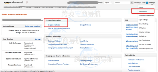 1、首先要登录自己的亚马逊账号,进入卖家中心后,找到“settings- account- payment information- deposit methods”,如下图: