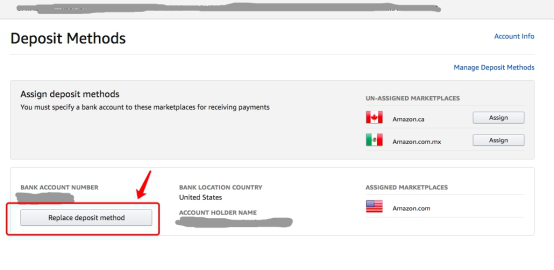 2、找到“Replace deposit methods”,然后页面会跳转到收款更换界面;