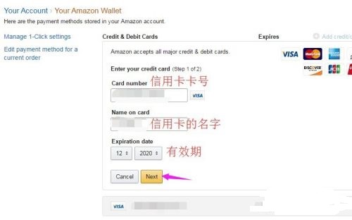五、在打开的窗口,依次填写信用卡卡号,姓名,有效期,点击”next“即下一步。如下图所示位置填写。