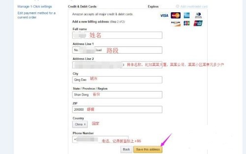 七、按照下图所示,依次填上你的姓名,你的信用卡账单地址的路段,具体的名称,城市,省份,邮编,国家(国家是要选择的),电话。电话要注意加上+86。最后点击”Save this address“,即保存这个地址。