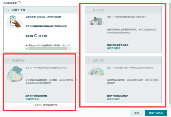 这三种广告类型就可以完美解决品牌旗舰店粉丝不足的问题,我们来看新增的三种发送对象。