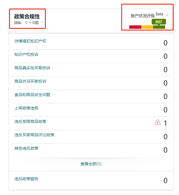 每年一到会员日或黑五网一等大促时,亚马逊政策就会收紧,旺季前扫号频率也会增加,因此卖家一定要避免进行一些风险操作。及时查看绩效通知,关注“账户状况”的“政策合规性”板块,确认账户状况评级情况,每日查看是否有停用风险。