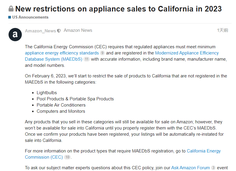 亚马逊发布公告称,加州能源委员会 (CEC) 要求受监管的电器必须满足最低电器能效标准并在现代化设备效率数据库系统 (MAEDbS)中注册并提供准确的信息,包括品牌名称、制造商名称和型号。