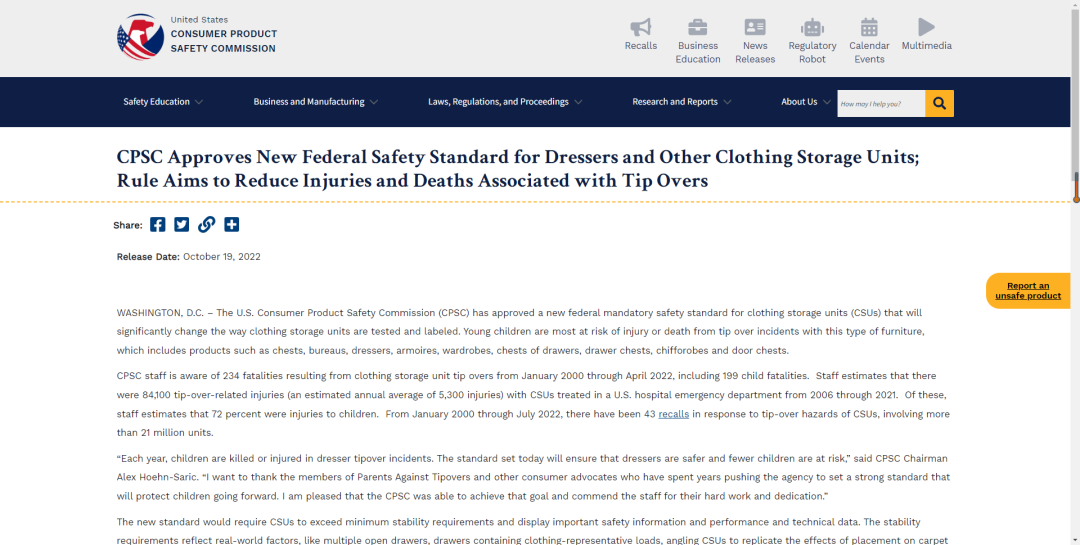 美国消费品安全委员会 (CPSC) 批准一项新的联邦安全标准《衣物存储单元安全标准》(16 CFR 1261),防止服装存储单元 (clothing storage units,CSU) 倾倒对儿童造成伤害,该标准将于180天后正式生效。