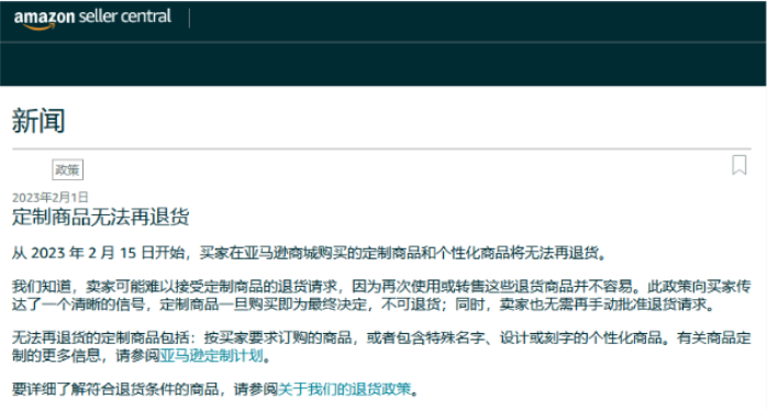 亚马逊了解卖家可能难以接受定制商品的退货请求,因为定制商品和个性化商品的特殊性,再次使用或转售这些退货商品并不容易。此政策向买家传达了一个清晰的信号,定制商品一旦购买即为最终决定,不可退货;同时,卖家也无需再手动批准退货请求。