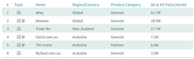 不难看出在大洋洲亚马逊和eBay仍然有着重要的地位,但其他本地电商品牌也有着不俗的表现,对卖家而言也意味着有更多的选择。