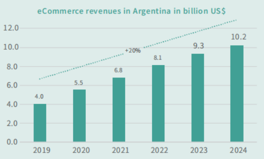 根据 Statista Global Consumer Survey 在 2020 年的一项研究,阿根廷电子商务市场正以每年 20% 的速度增长,市场发展空间非常大。Statista 预计,阿根廷的电商市场总规模在 2024 年预计会达到 100 亿美元。