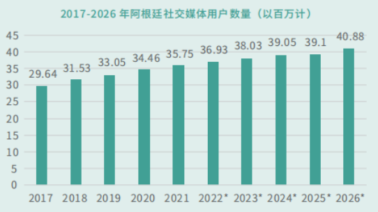 就社媒渗透率而言,根据 Statista 的研究,截至 2021 年 9 月,阿根廷有 3575 万社交媒体用户,相当于总人口的 82%。预计到 2026 年,这一数字将增长到 4088 万。