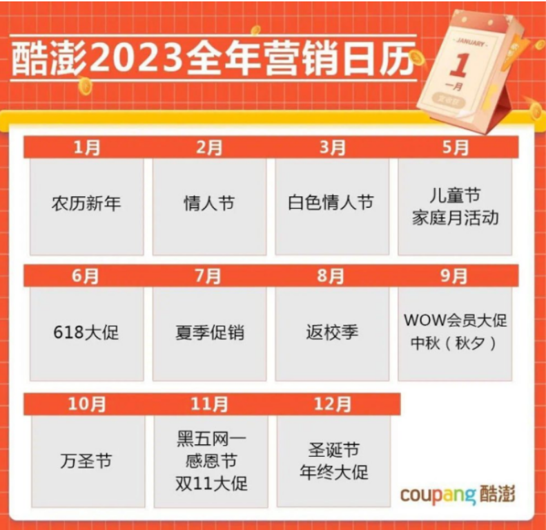 跨境电商如何引流必须了解各大促销节点,提前了解促销节点可以抢占先机,而Coupang2023年的营销日历和选品趋势小编已帮大家整理出来,帮助大家快人一步抢占市场。