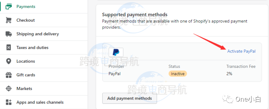 登录Shopify后台,进⼊ Setting(设置)> Payment Provider(⽀付服务提供商),点击 Activate PayPal Express Checkout 绑定PayPal企业账⼾。