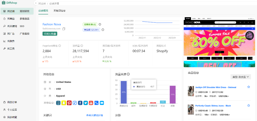 以上数据来源:Diffshop店湖独立站数据监控及选品工具
