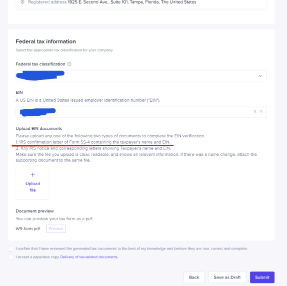 5、这一步其实是会短期卡住大部分人的环节,除填写企业法人相关资料外,还需要提交对应的纳税编号。目前支持两种形式: