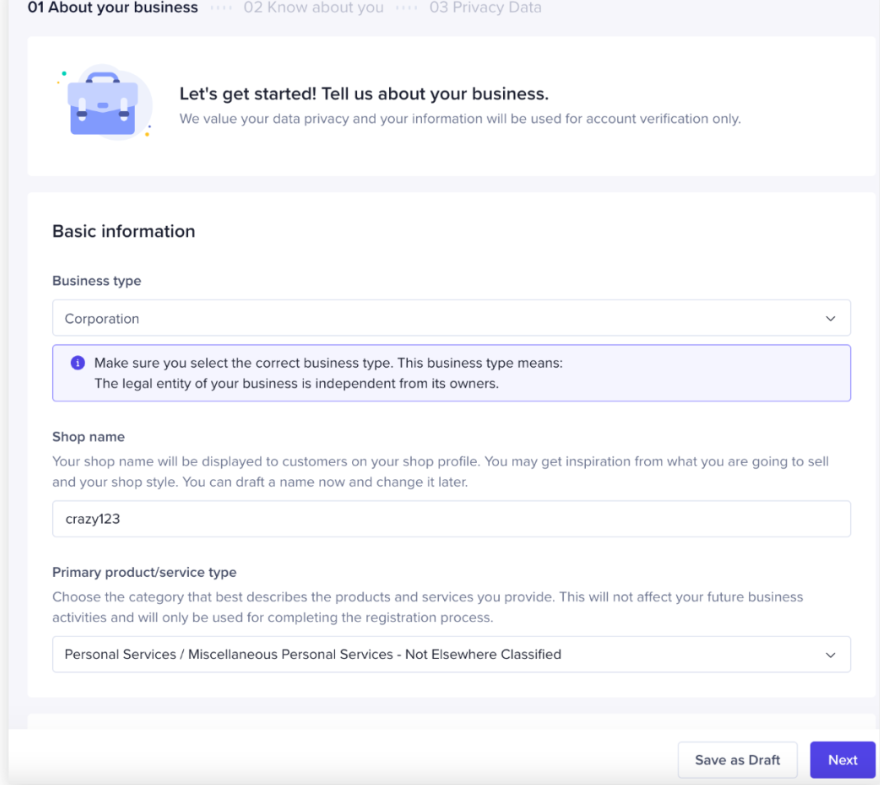 3、注册第一步需要你选择Business type商业类型,店铺名称及经营类型