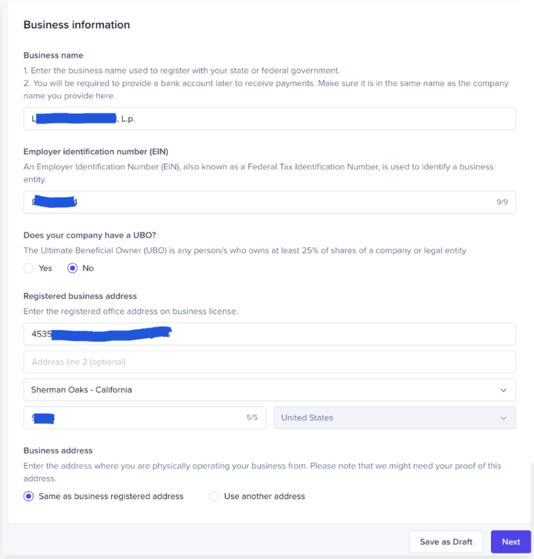 4、继续往下填企业信息,公司名称如实填写,这边提示说会要求你填写UBO与否,这个是指是否有大于25%的最终受益人,请根据你的美国企业资料实际情况填写。
