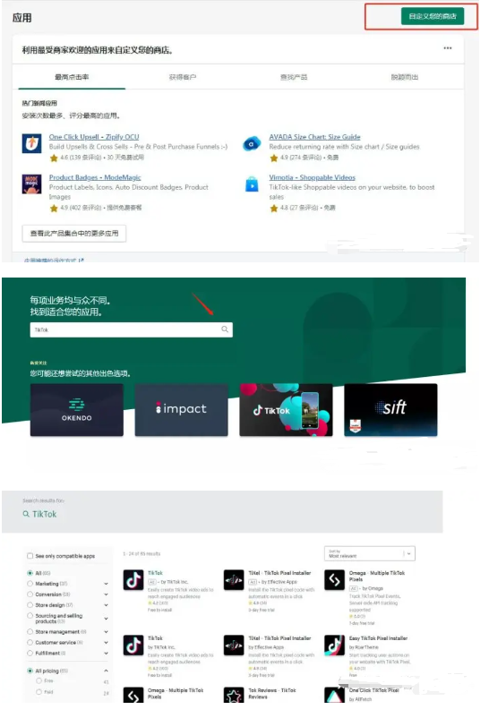 1、进入Shopify后台,点击应用~点击自定义您的商店~在搜索栏里输入TikTok~点击安装。