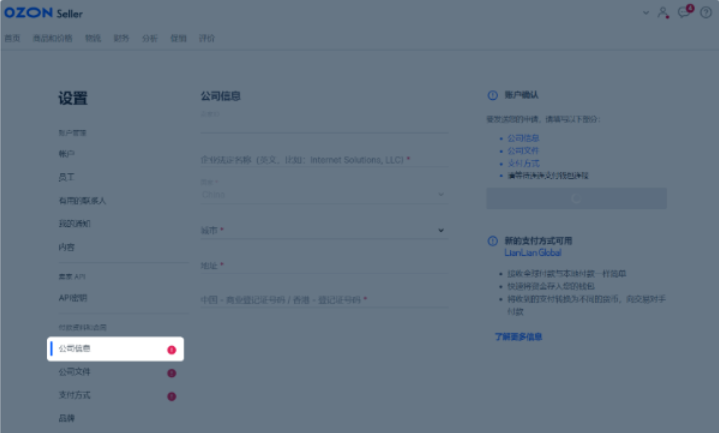 如果电子钱包无法绑定,个人中心将被停用,请联系LianLian Pay客服了解出错原因。若问题能够得到解决,请在Ozon注册新的卖家个人中心,并将钱包绑定至新的个人中心,请填写完所有字段并点击 “发送以供审核”。