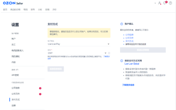 点击绑定钱包,在打开的窗口中,在连连支付平台上进行授权或注册。注册时,请将公司的企业钱包绑定至Ozon。然后,转到卖家个人中心。