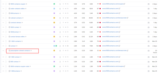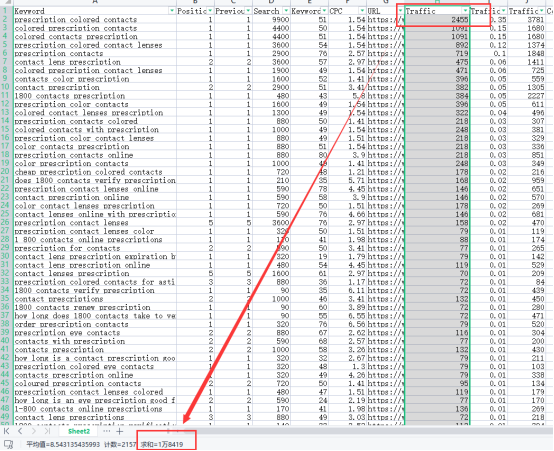 另外,我们可以把整个关键词导出成Excel表格,这样我们可以筛选出prescription colored contacts这个关键字簇相关的关键词一共给他们带来多少流量。